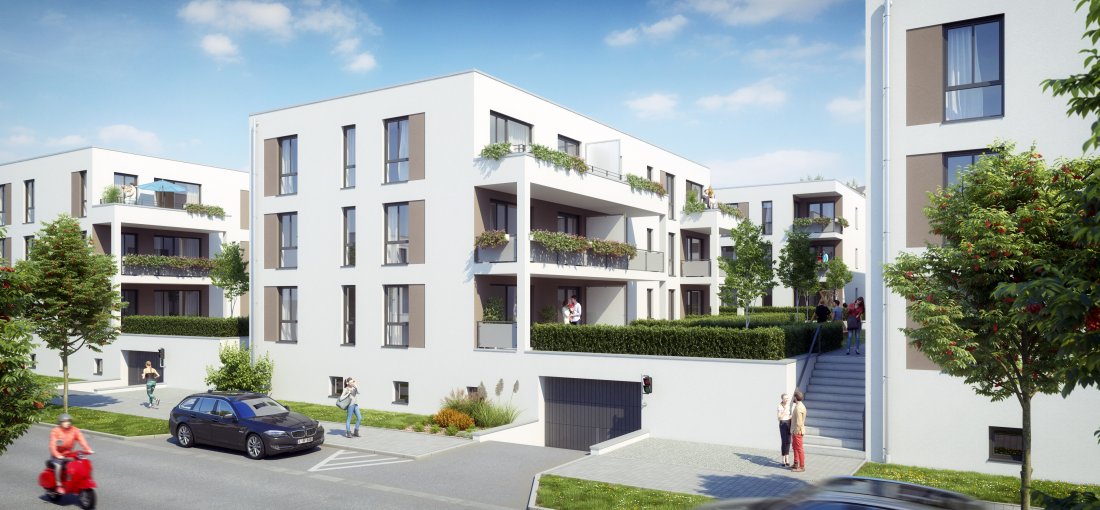 Neubauwohnungen verteilt auf 8 Punkthäuser mit insgesamt 57 Wohneinheiten im Stadtnorden von Regensburg.